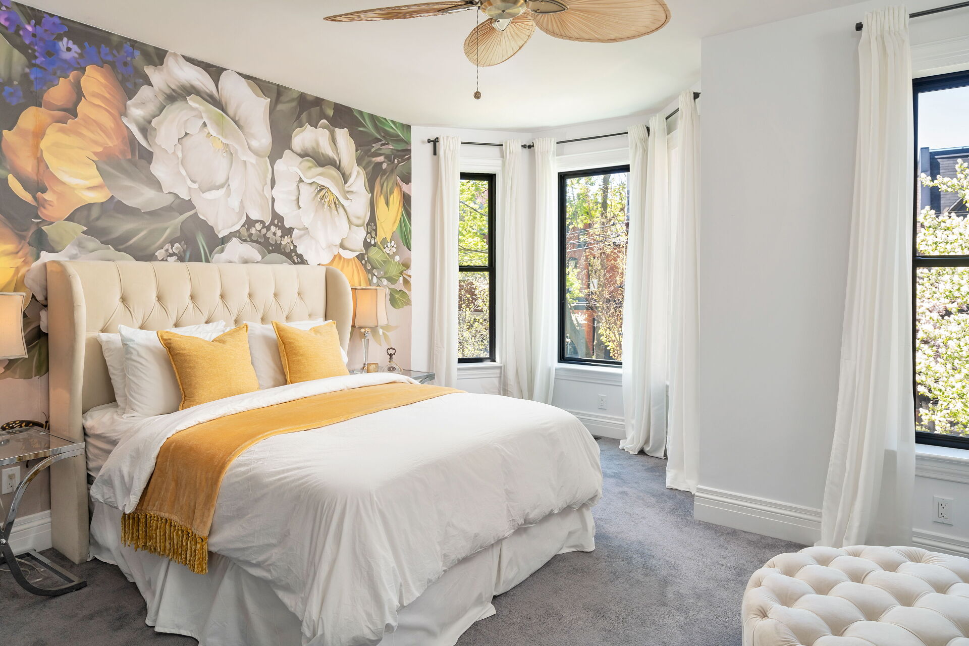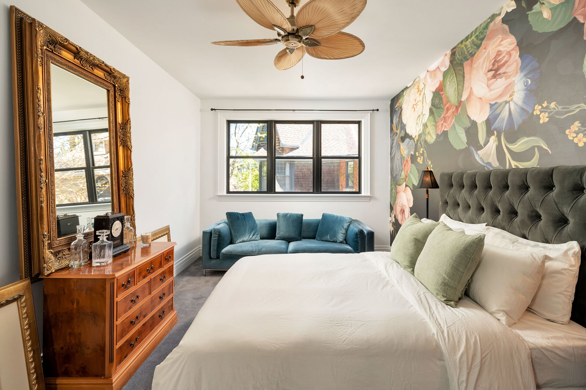 In the bedrooms, Mr. Pfeiffer had floral wallpaper murals printed in Turkey to match the size of the walls.