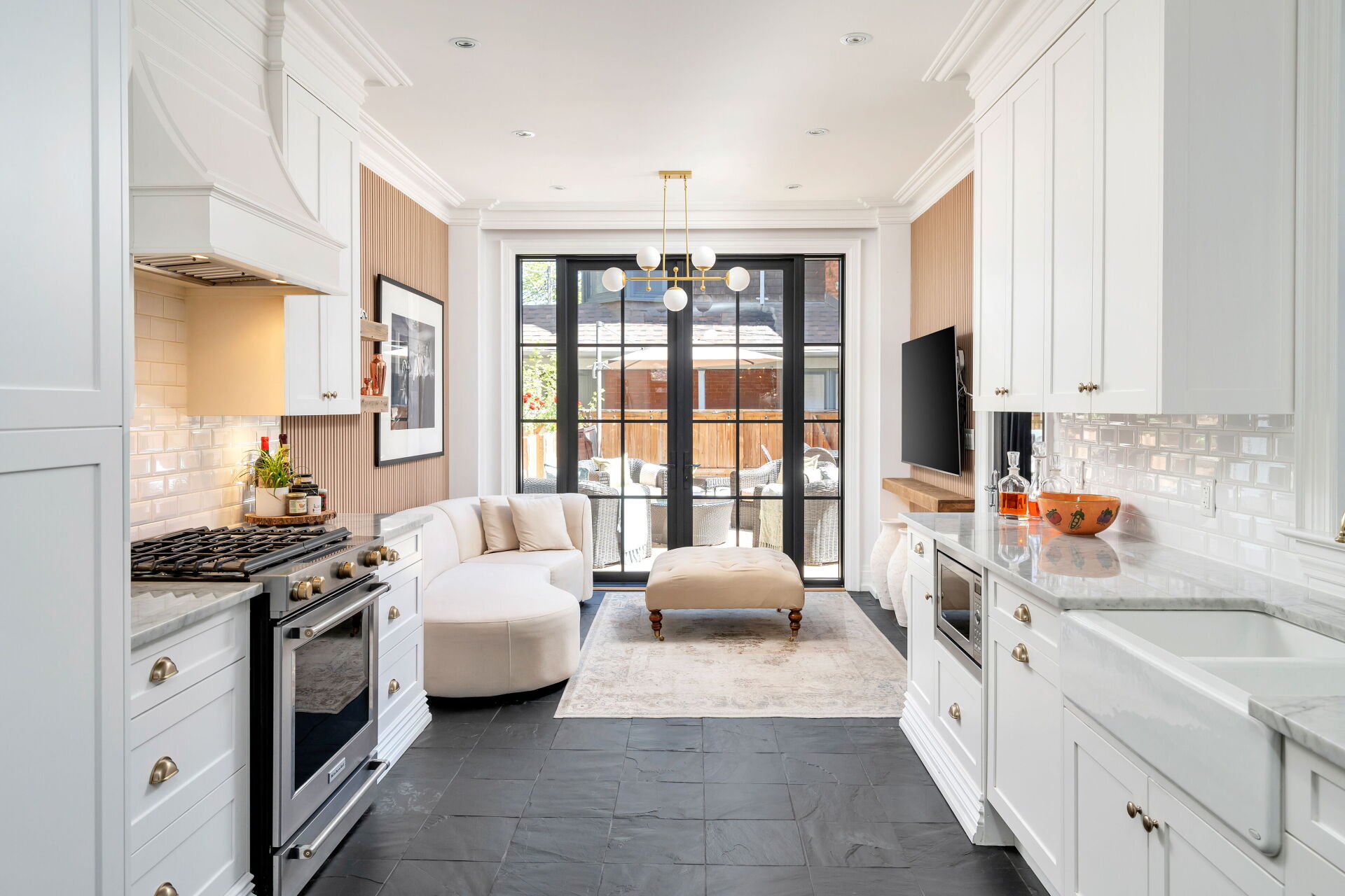 In the kitchen, Mr. Pfeiffer retained the white cabinets but refinished the marble countertop. He also changed the taps and cabinet hardware to an antique gold finish.
