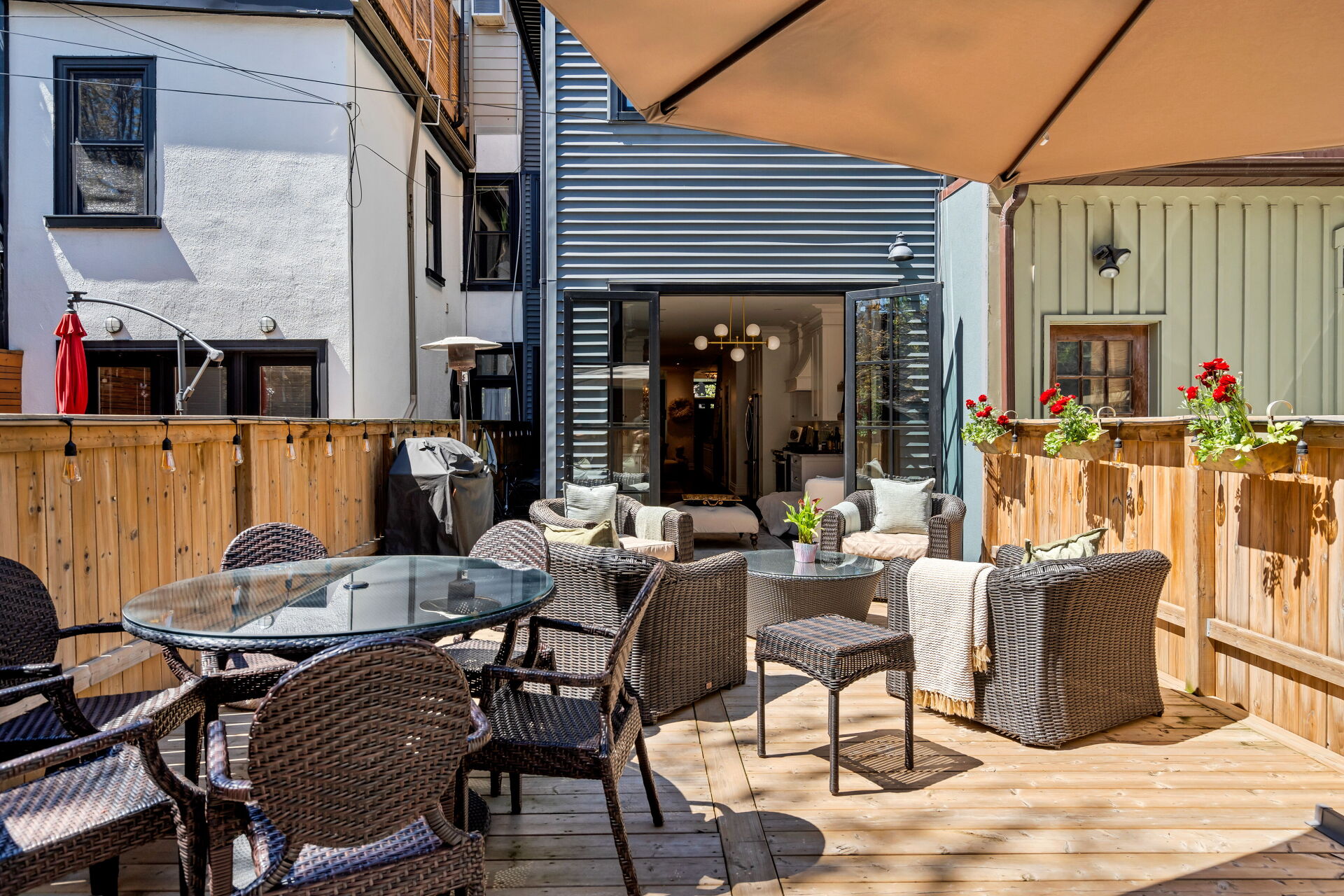He had the outdoor deck raised to the level of the kitchen so that it’s easy to step outside for lounging and dining or soaking in the hot tub.