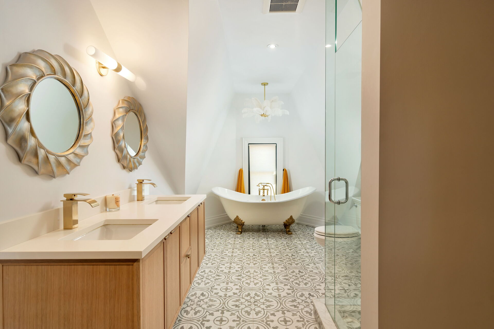 The large bathroom has a double vanity, claw foot tub and ceramic floor ties imported from Portugal.
